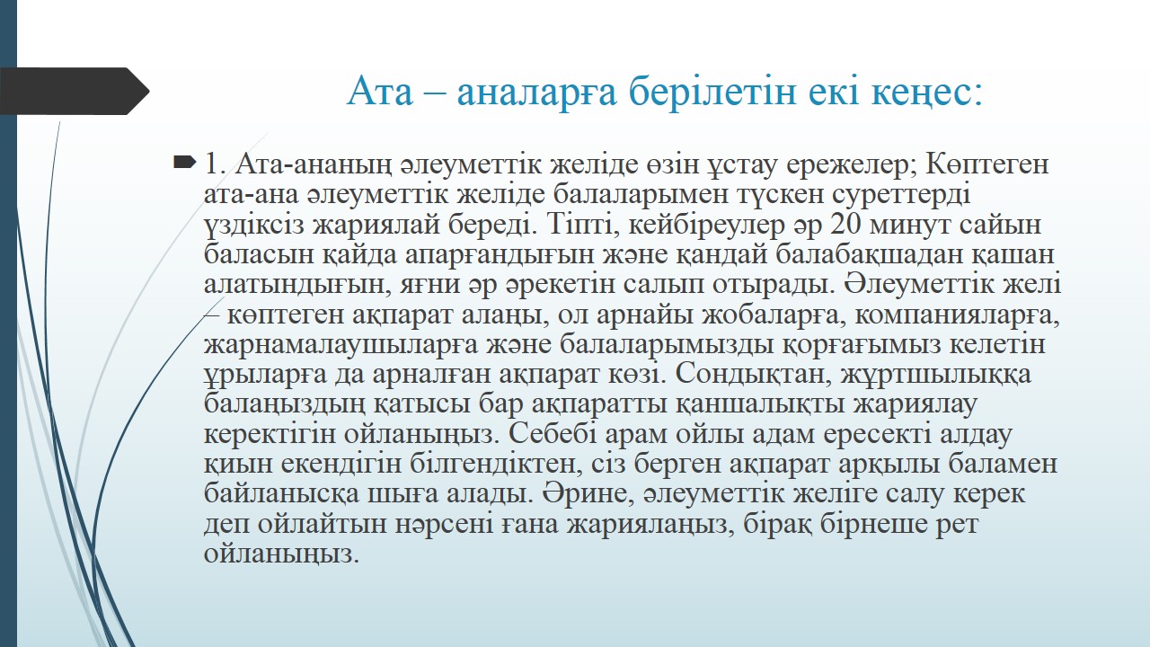 - Ата-ананың әлеуметтік желіде өзін ұстау ережелері Көптеген ата-ана әлеуметтік желіде балаларымен түскен суреттерді үздіксіз жариялай береді. Тіпті, кейбіреулер әр 20 минут сайын баласын қайда апарғандығын және мектептен (балабақшадан) қашан алатындығын, яғни әр әрекетін салып отырады. Әлеуметтік желі – көптеген ақпарат алаңы, ол арнайы жобаларға, компанияларға, жарнамалаушыларға және балаларымызды қорғағымыз келетін ұрыларға да арналған ақпарат көзі. Сондықтан, жұртшылыққа балаңыздың қатысы бар ақпаратты қаншалықты жариялау керектігін ойланыңыз. Себебі арам ойлы адам ересекті алдау қиын екендігін білгендіктен, сіз берген ақпарат арқылы баламен байланысқа шыға алады. Әрине, әлеуметтік желіге салу керек деп ойлайтын нәрсені ғана жариялаңыз, бірақ бірнеше рет ойланыңыз.