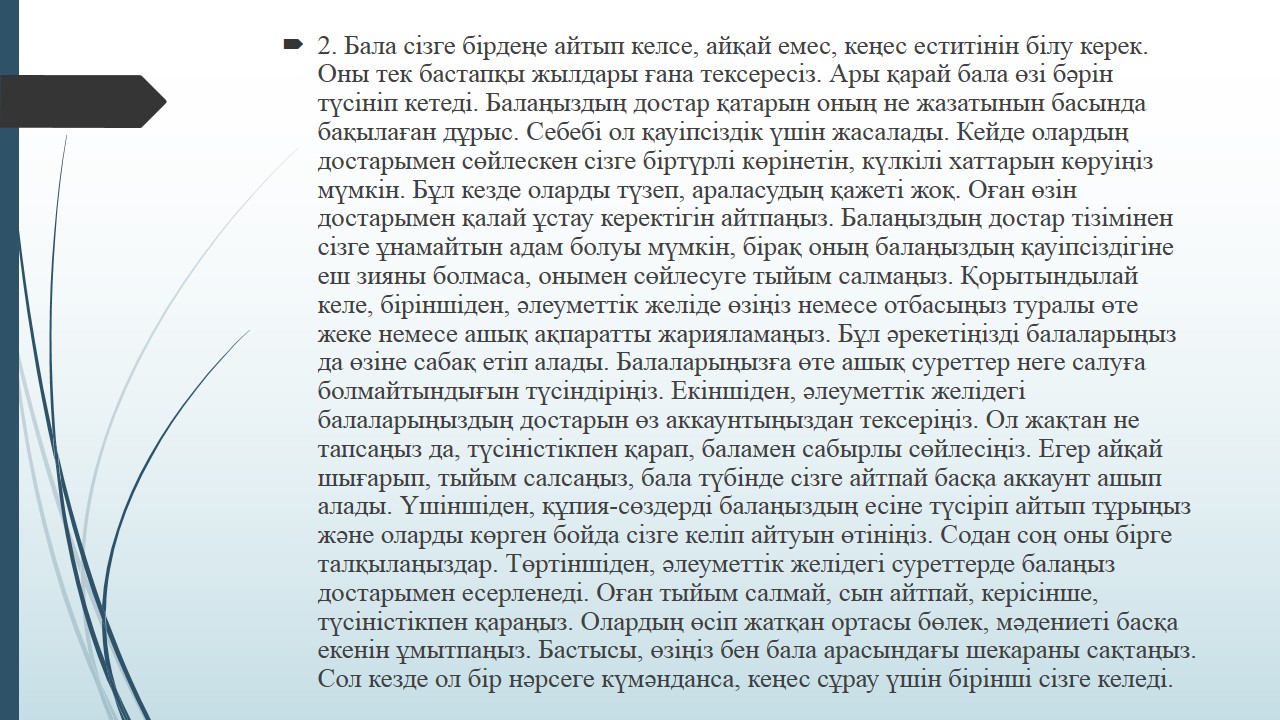 2. Баланың әлеуметтік желіде өзін ұстау ережелері Балаңыздың (қазір 6-7 жастан бастайды) әлеуметтік желіге тіркелгенін байқасаңыз, оның енді көпшілік үшін ашық екенін түсініп, онымен жеке сөйлесіңіз. Әлемде ниеті таза емес адамдар бар екендігін түсіндіріңіз. Сондықтан, "маркер-сөздерді" үйретіп қойыңыз. Бұл сөздер бірдеңенің дұрыс еместігін көрсететінін және маркер-сөздерді көрген бойда сізге келуін сұраңыз. Маркер-сөздерге мысалы мыналар жатады: "Сен сондай әдемісің!", "ата-анаң үйде көп болмай ма?", "көп саяхаттайсыңдар ма?", "ата-анаң қайда жұмыс жасайды?", "үйде жалғызсың ба?" және т.б. Балаңыздан "маркер-сөздер есіңде ме" деп әрдайым сұрап отырыңыз. Балаңыз бір күні "маған мынадай біртүрлі хат келді" немесе "Әдемісің, танысайық" деді деп қасыңызға келсе, айқайламай, сабырмен бірге сол адамның аккаунтын қараңыздар. Егер ол адам күмән тудырмаса, ендеше, бәрі жақсы уайымдайтын ештеңе жоқ. Балаңыз екеуіңіздің арасында сенімді қатынас болу керек. Бала сізге бірдеңе айтып келсе, айқай емес, кеңес еститінін білу керек. Қазір қылмыскерлер хаттарын өзгерте бастады. Олар жасөспірімдерден көмек сұрайды. Бала өзін біреуге керек сезініп, сеніп қалады. Мысалы, "Менің сенімен құрдас балам бар. Екеуміз онша сөйлеспейміз. Көмегіңді берші, не істесе болады?" деген секілді хаттар жазатын болған. Сөйтіп, баланың сеніміне кіріп алып, басқа ақпараттар сұрауға кіріседі. Бұл жаңа маркер-сөзге жатады. Балаңыздың достар қатарындағы адамдардың аккаунтына кіріп, тексеріңіз. Оны тек бастапқы жылдары ғана тексересіз. Ары қарай бала өзі бәрін түсініп кетеді. Балаңыздың достар қатарын оның не жазатынын басында бақылаған дұрыс. Себебі ол қауіпсіздік үшін жасалады. Кейде олардың достарымен сөйлескен сізге біртүрлі көрінетін, күлкілі хаттарын көруіңіз мүмкін. Бұл кезде оларды түзеп, араласудың қажеті жоқ. Оған өзін достарымен қалай ұстау керектігін айтпаңыз. Балаңыздың достар тізімінен сізге ұнамайтын адам болуы мүмкін, бірақ оның балаңыздың қауіпсіздігіне еш зияны болмаса, онымен сөйлесуге тыйым салмаңыз. Қорытындылай келе, біріншіден, әлеуметтік желіде өзіңіз немесе отбасыңыз туралы өте жеке немесе ашық ақпаратты жарияламаңыз. Бұл әрекетіңізді балаларыңыз да өзіне сабақ етіп алады. Балаларыңызға өте ашық суреттер неге салуға болмайтындығын түсіндіріңіз. Екіншіден, әлеуметтік желідегі балаларыңыздың достарын өз аккаунтыңыздан тексеріңіз. Ол жақтан не тапсаңыз да, түсіністікпен қарап, баламен сабырлы сөйлесіңіз. Егер айқай шығарып, тыйым салсаңыз, бала түбінде сізге айтпай басқа аккаунт ашып алады. Үшіншіден, маркер-сөздерді балаңыздың есіне түсіріп айтып тұрыңыз және оларды көрген бойда сізге келіп айтуын өтініңіз. Содан соң оны бірге талқылаңыздар. Төртіншіден, әлеуметтік желідегі суреттерде балаңыз достарымен есерленеді. Оған тыйым салмай, сын айтпай, керісінше, түсіністікпен қараңыз. Олардың өсіп жатқан ортасы бөлек, мәдениеті басқа екенін ұмытпаңыз. Бастысы, өзіңіз бен бала арасындағы шекараны сақтаңыз. Сол кезде ол бір нәрсеге күмәнданса, кеңес сұрау үшін бірінші сізге келеді.