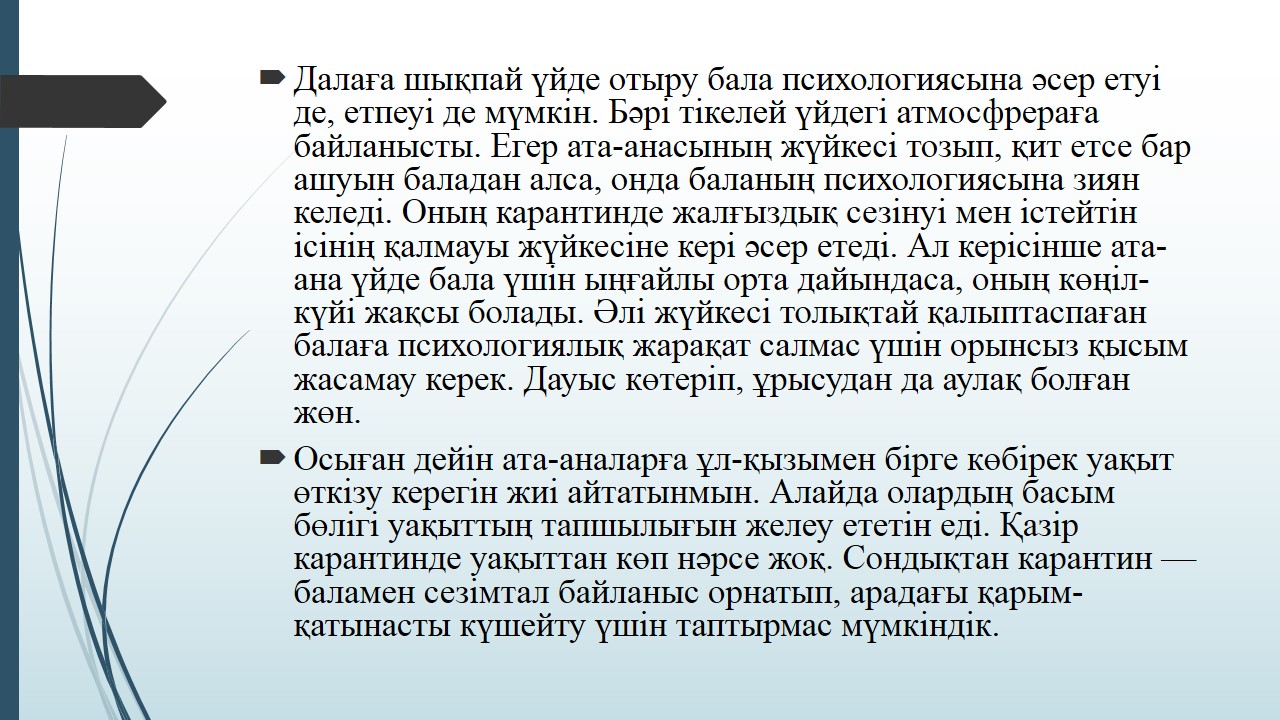 "Егер бала проблемасын айтып келсе, оны бас салып кінәлап, ұрысудың қажеті жоқ. Телефонды да бірден тартып алып, ғаламторға шектеу қоймау керек. Мұндай жағдайда бала ата-анасынан көңілі қалып, екінші мәселесін айтпайтын болады. Әке-шешелері балаларымен байыппен сөйлесіп, олардың еш кінәсінің жоқтығын түсіндіруі керек. Қамқорлықты сезінген баланың сенімі оянып, тығырықтан шығатынына сенеді. Бізде көп ата-аналар балаларымен сөйлеспейді, оларды не мазалап жүргенін байқай бермейді. Ал білген кезде кеш болуы мүмкін", – деді әлеуметтанушы Халида Әжіғұлова.