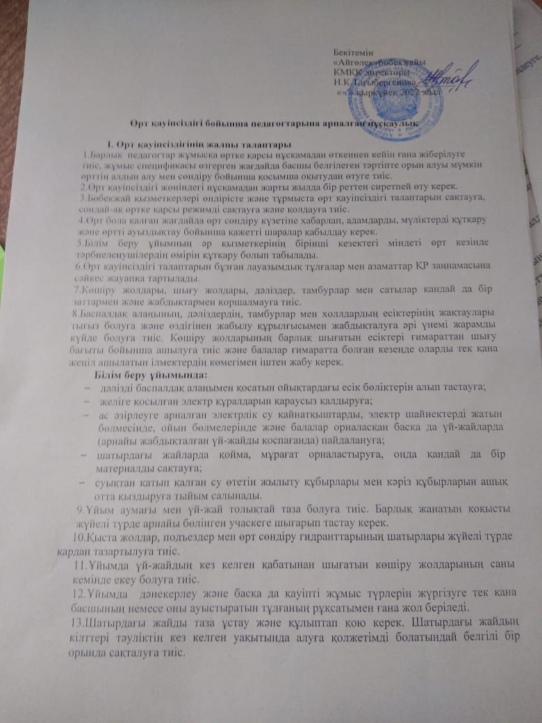 Өрт қауіпсіздігі бойынша педагогтарына арналған нұсқаулық