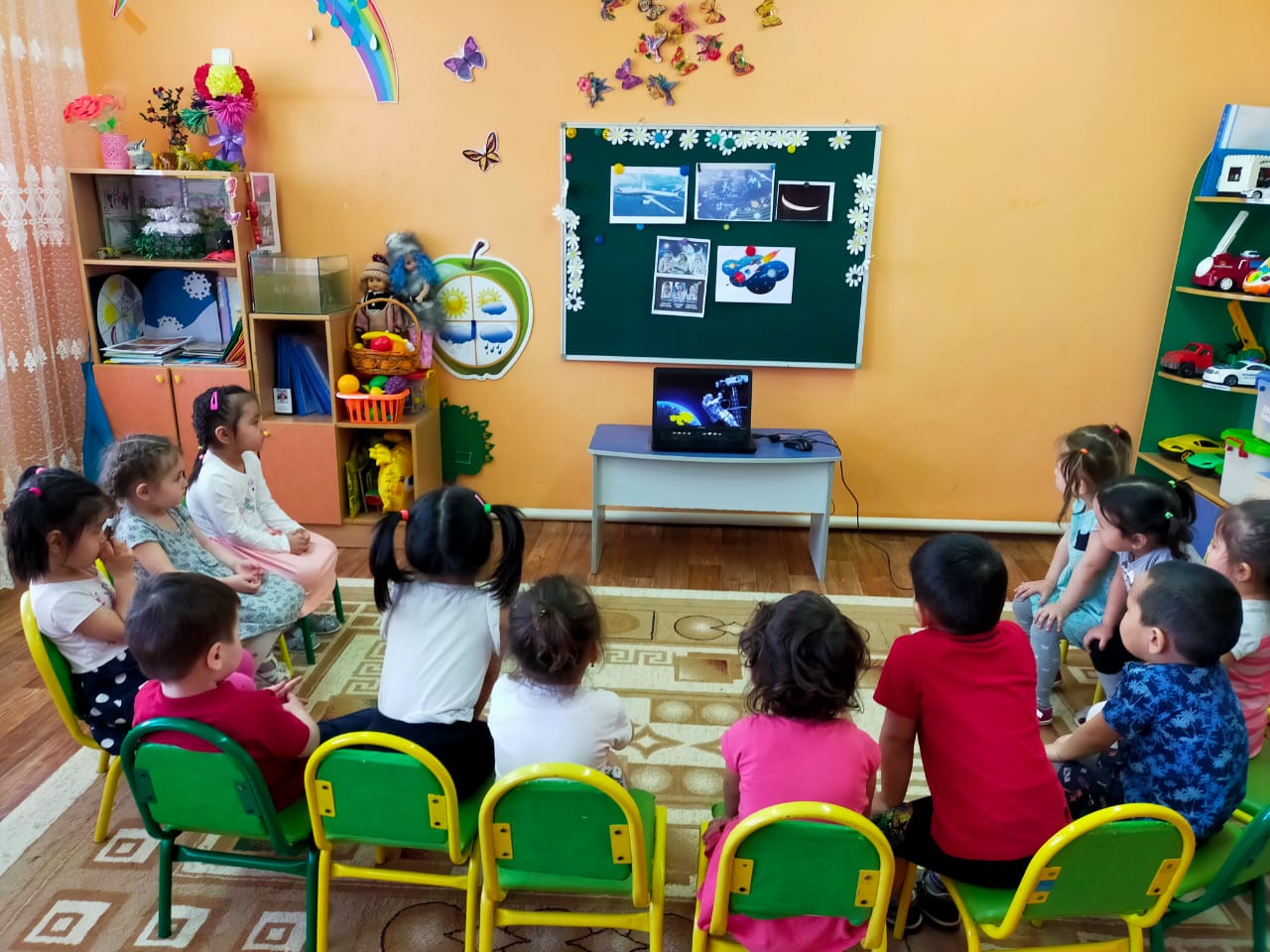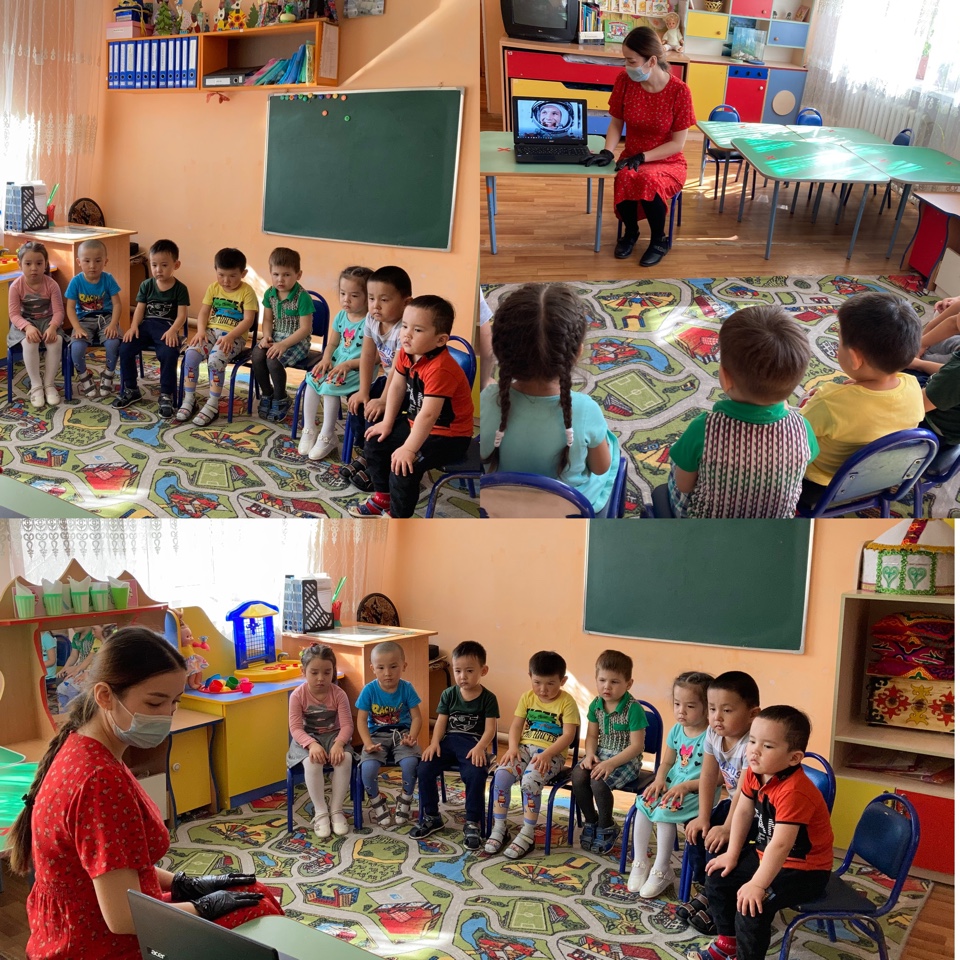 «Ғарышкер және ғарыш әлемі» атты апталықтың бейсенбі күнгі жоспарына сәйкес ортаңғы “Құлпынай” тобының тәрбиеленушілеріне "Ғарышқа саяхат" атты бейнеролик көрсетілді