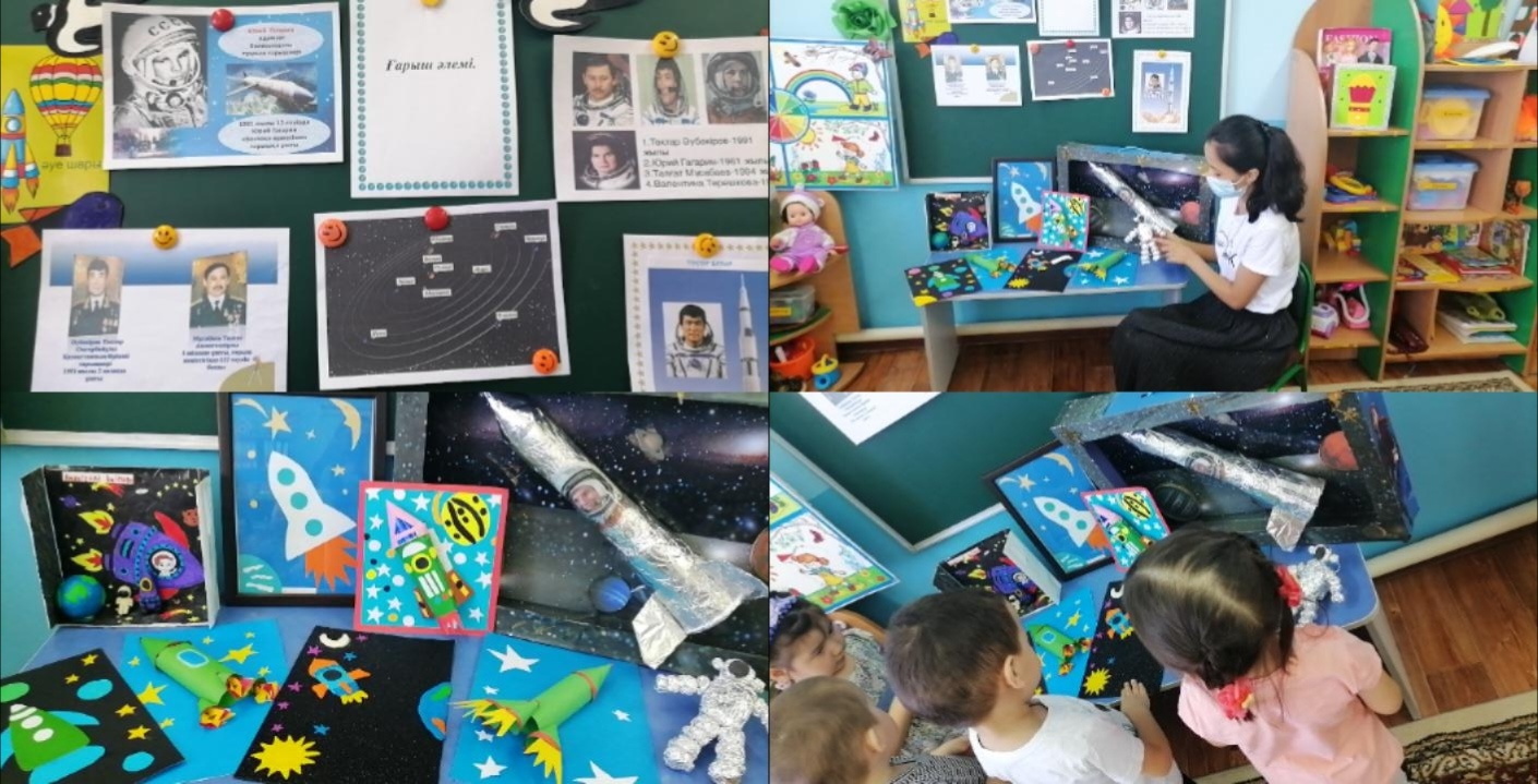«Ғарышкер және ғарыш әлемі» атты апталықтың сейсенбі күнгі жоспарына сәйкес кіші “Көбелектер” тобында “Ғарыш әлемі” тақырыбында тәрбиеленушілердің қолөнер көрмесі өтті.
