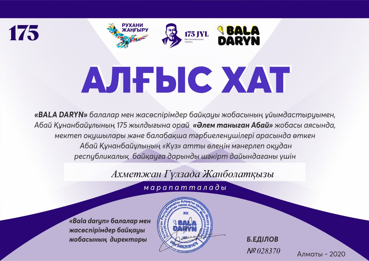 «BALA DARYN» балалар мен жасөспірімдер байқауы жобасының ұйымдастыруымен, Абай Құнанбайұлының 175 жылдығына орай «Әлем таныған Абай» жобасы аясында