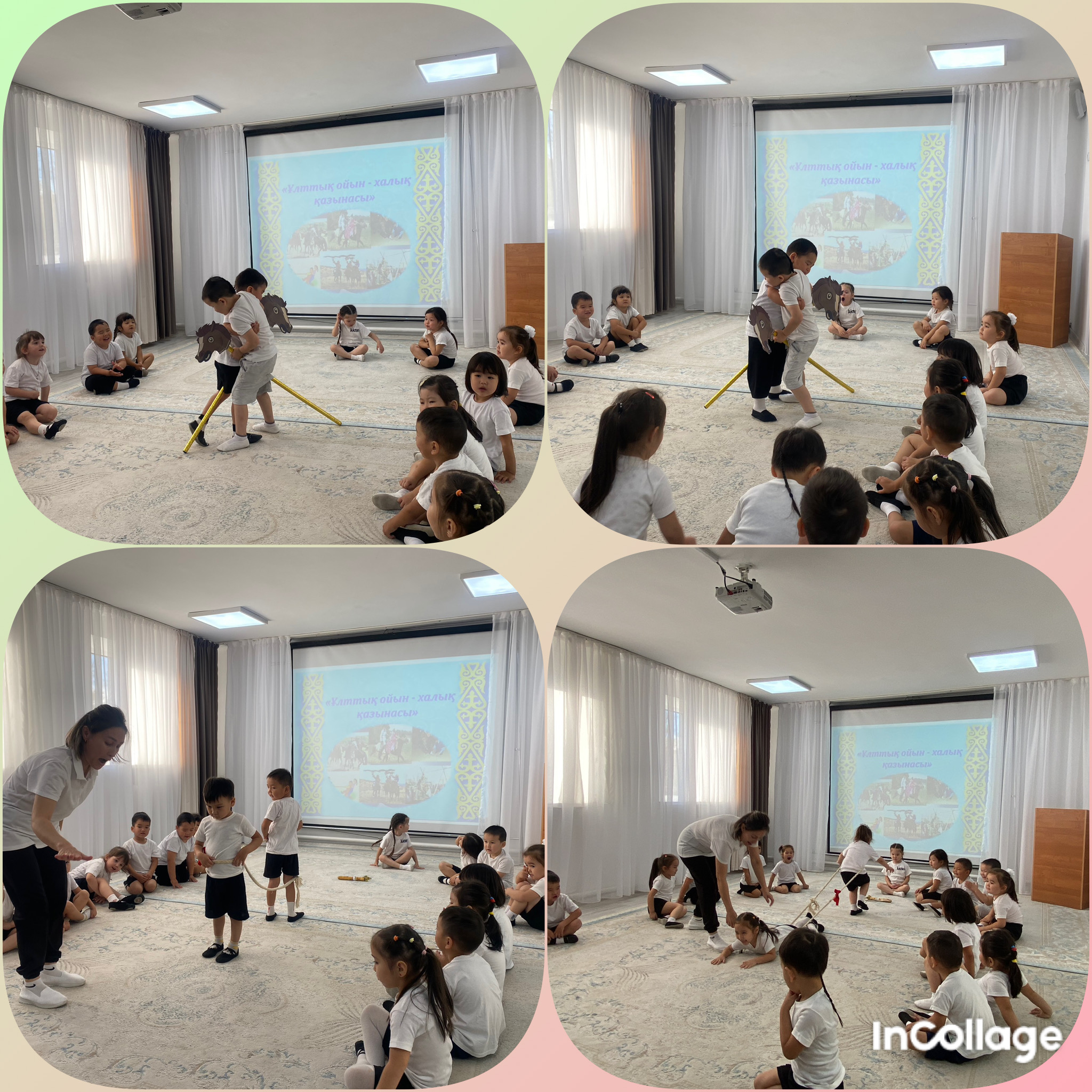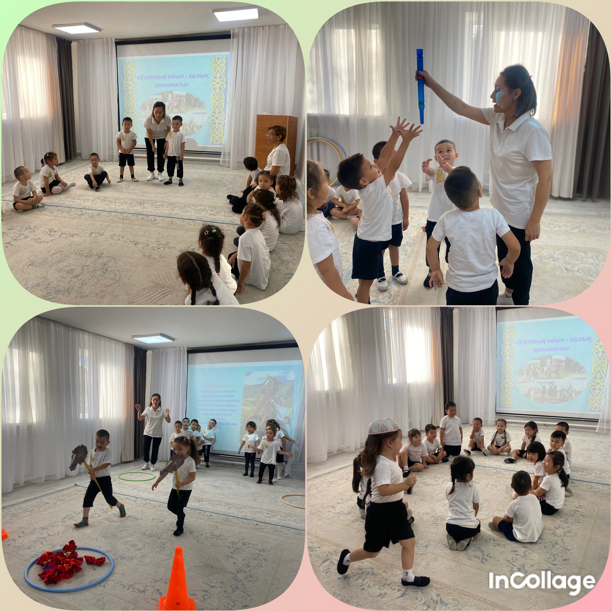 Апталықтың 4-ші күні Қазақтың салт – дәстүрі , әдет – ғұрпын, туған елге, жерге, өз Отанына деген сүйіспеншілік сезімдерін , ұлттық ойынға қызығушылықтарын арттыру мақсатында бөбекжайымыздың ересек топ тәрбиеленушілері арасында “Арқан тартыс”, “Киіз үй”, “ Білектесу”, “Ат бақыл”, “ Сиқырлы таяқ”, “Теңге ілу”, “ Тақия тастамақ”, “Аударыспақ” “Жаяу тартыс” ұлттық ойындар ойнатылды. #Республикакүні
