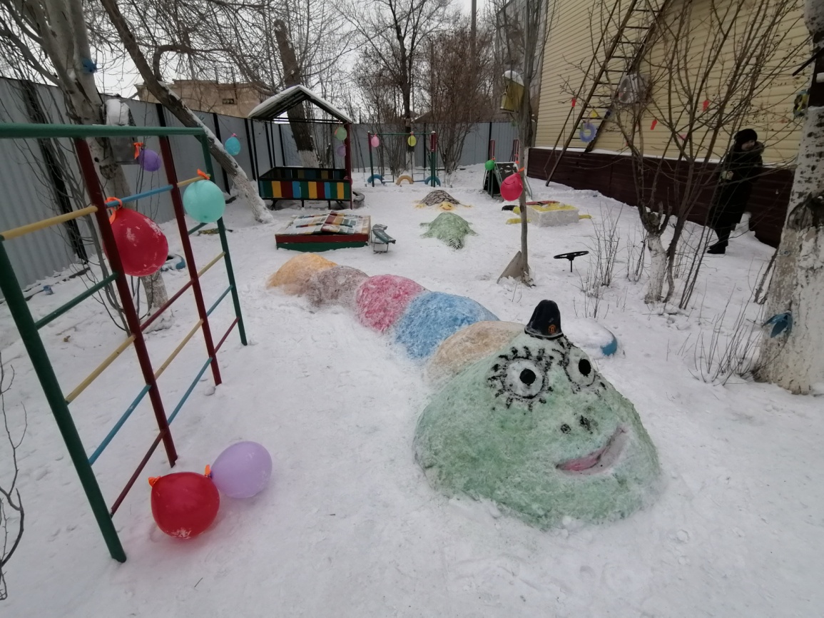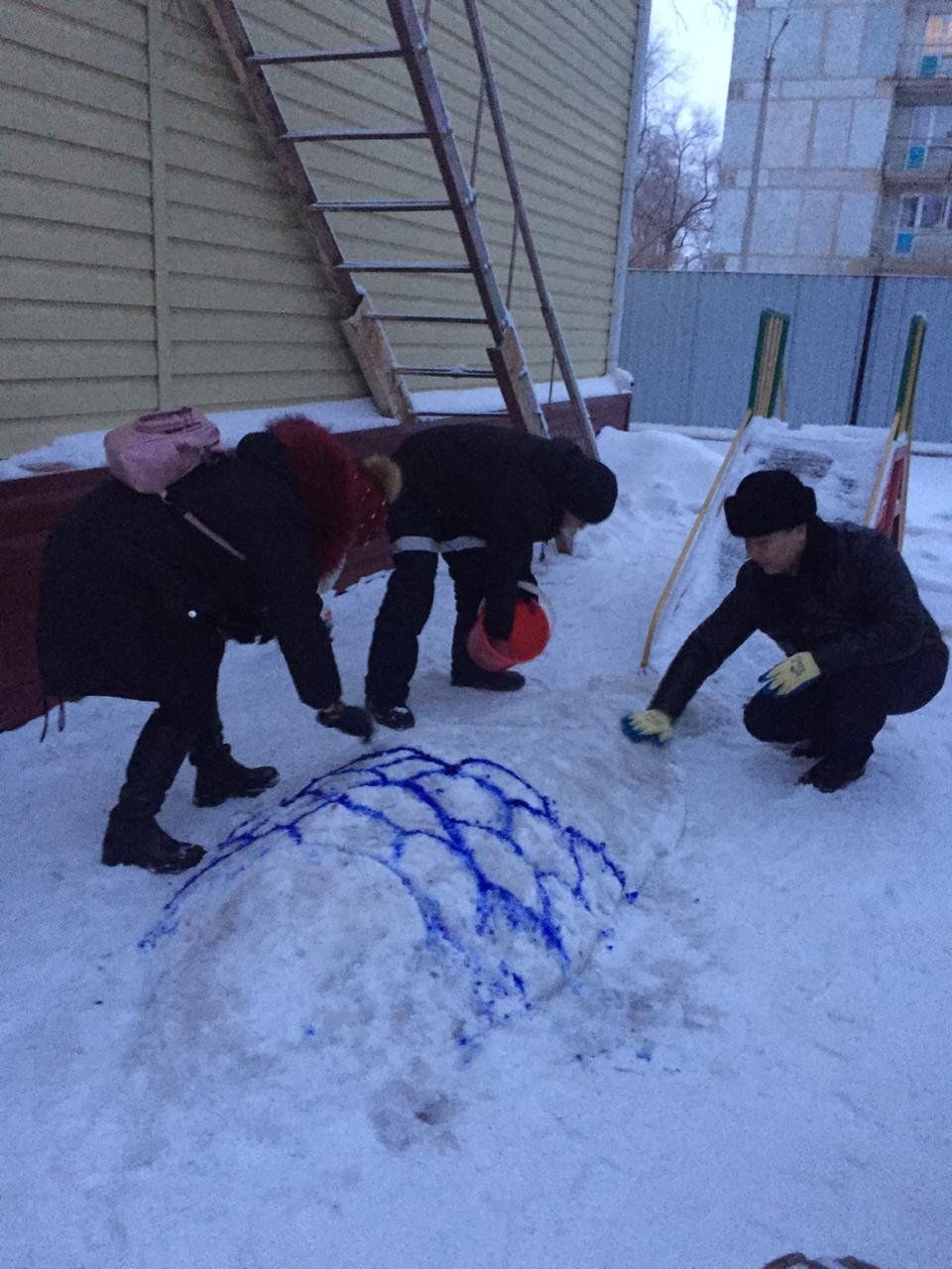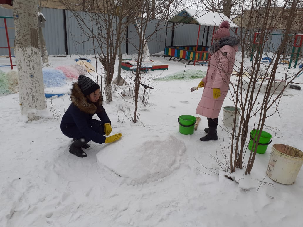 Қардан, мұздан жасалған әртүрлі мүсіндер айналаны әдемі қиялға, ғажайып бір ертегі әлеміне көз шалғандай әсер етеді. № 7 «Айгөлек»яслибөбекжайының алаңында, қар қалашығында 16 мүсін, сырғанақ жасалған.