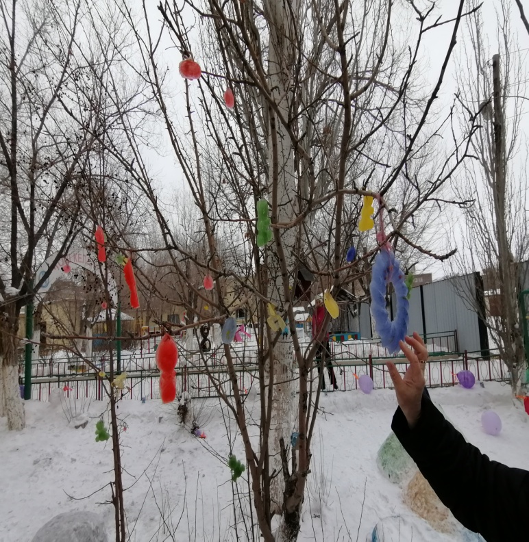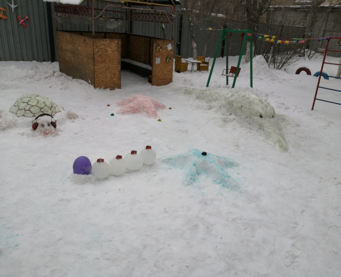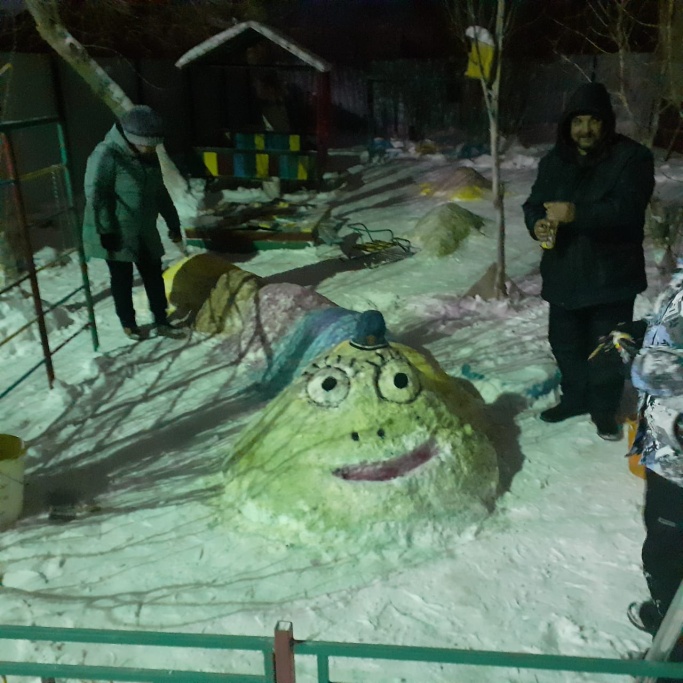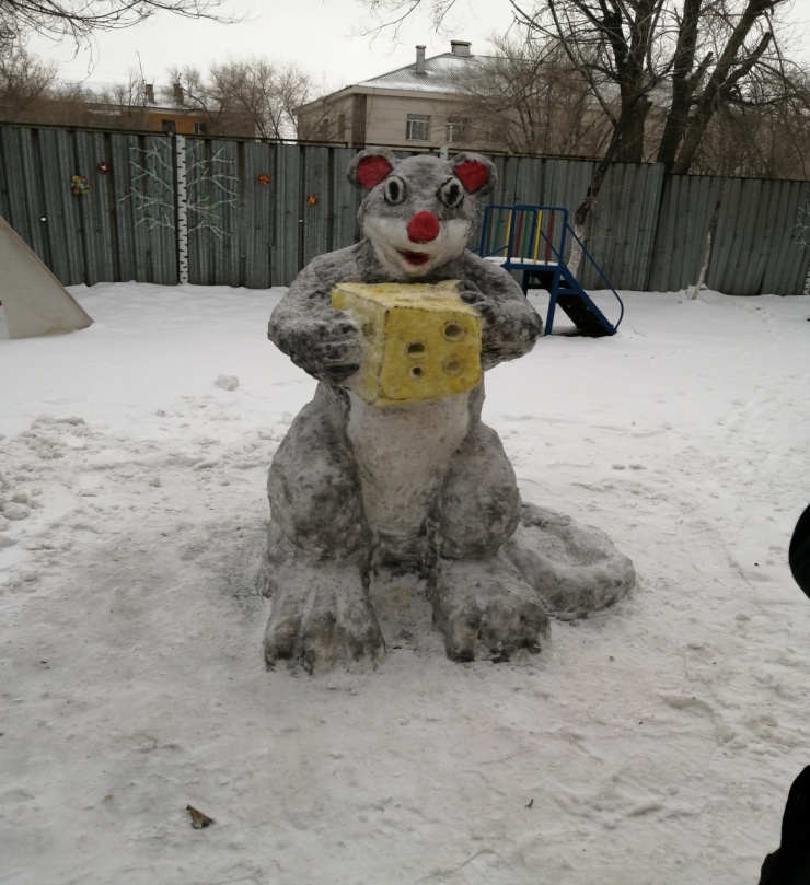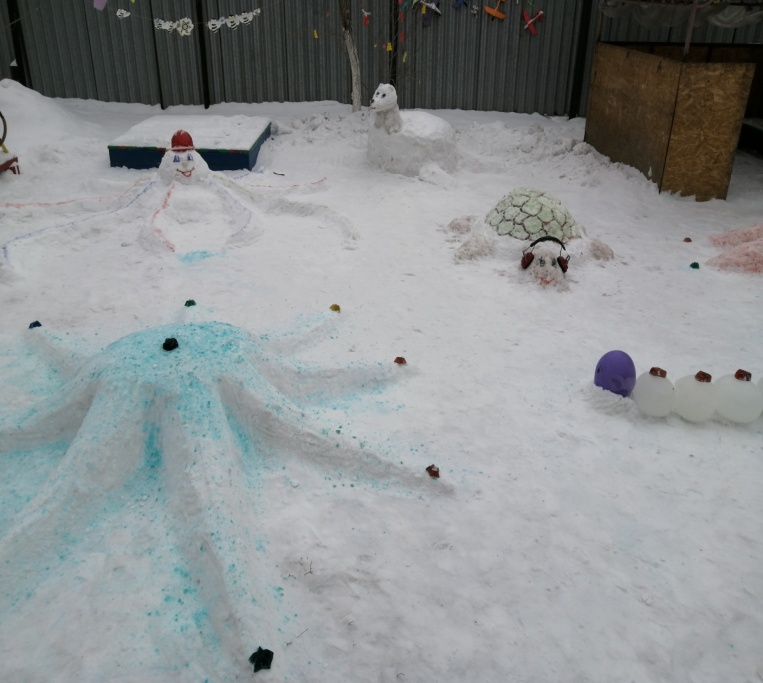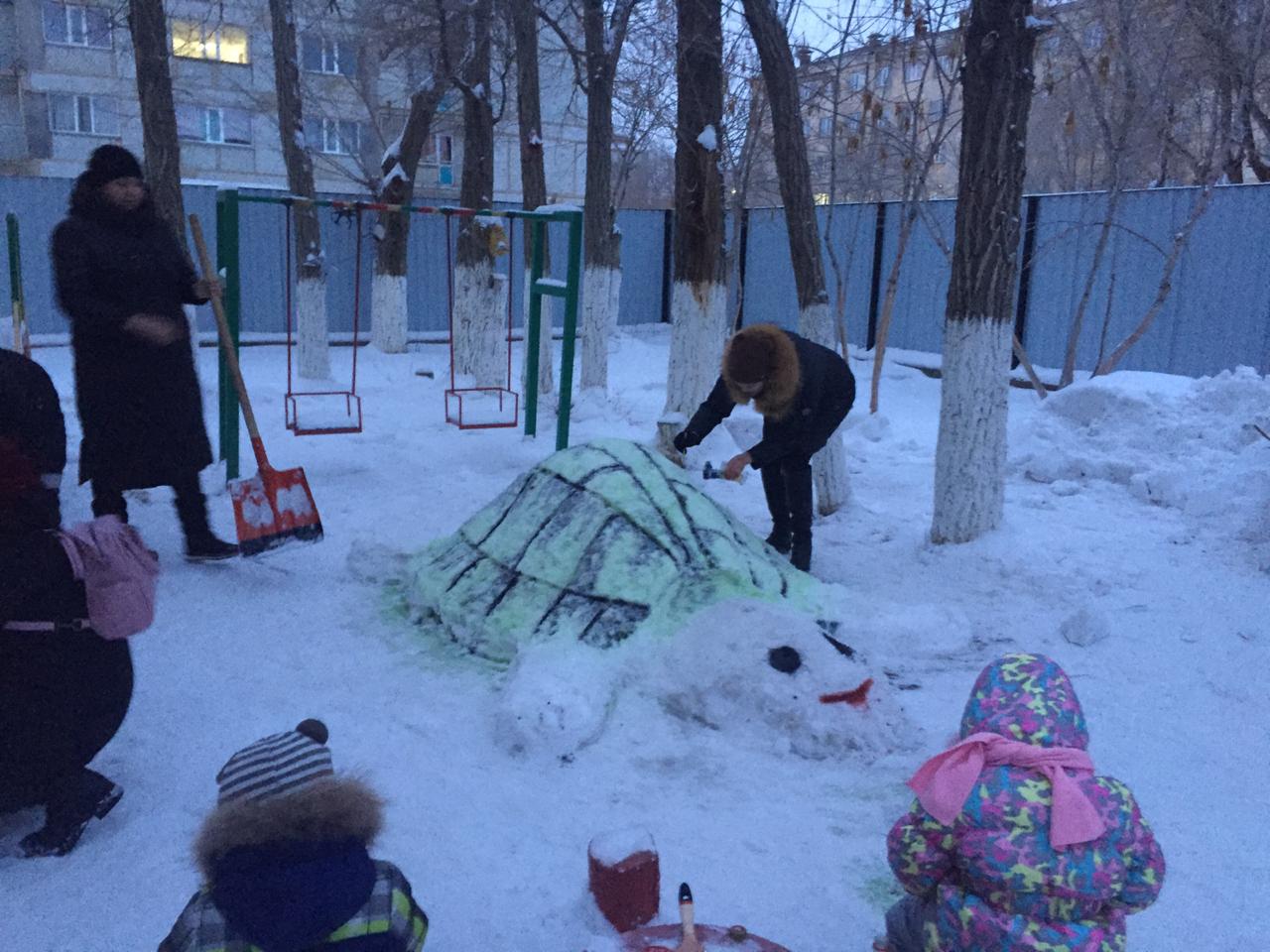 Қардан, мұздан жасалған әртүрлі мүсіндер айналаны әдемі қиялға, ғажайып бір ертегі әлеміне көз шалғандай әсер етеді. № 7 «Айгөлек»яслибөбекжайының алаңында, қар қалашығында 16 мүсін, сырғанақ жасалған.