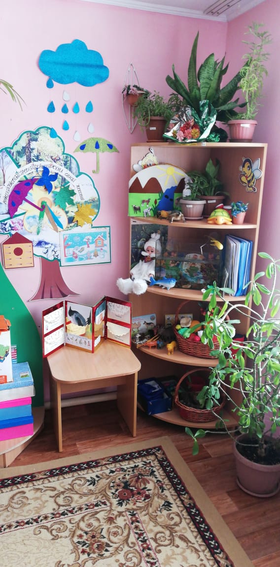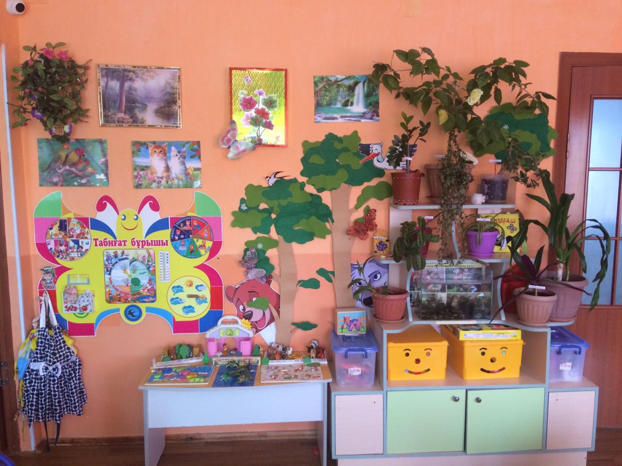 Өсімдіктер мен жануарларға күтім жасау дағдыларын қалыптастыру,барлық тіршілік иелеріне қамқор болуға тәрбиелеу және т.с.с жұмыстарды атқарып келеді. Байқаудың шарттарына сай барлық топтарда табиғаттың бұрышын табиғи материалдармен безендірілген: қабықшалар, қиыршық тастар, конустар, бұтақтар, балалар қолөнері.Табиғаттың бір бұрышына өсімдіктер мен жануарлардың бейнелері, макеттері қойылған стандартқа сай білім беру бағдарламасының талаптары ескерілген.