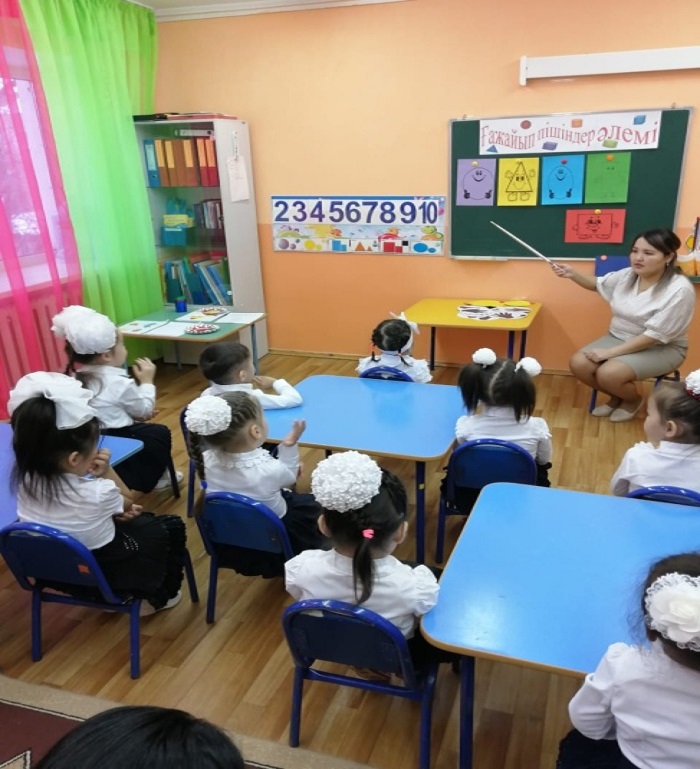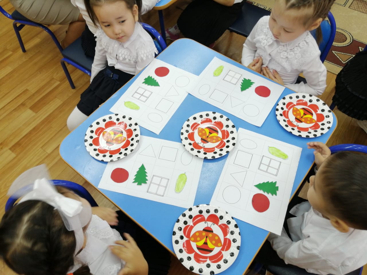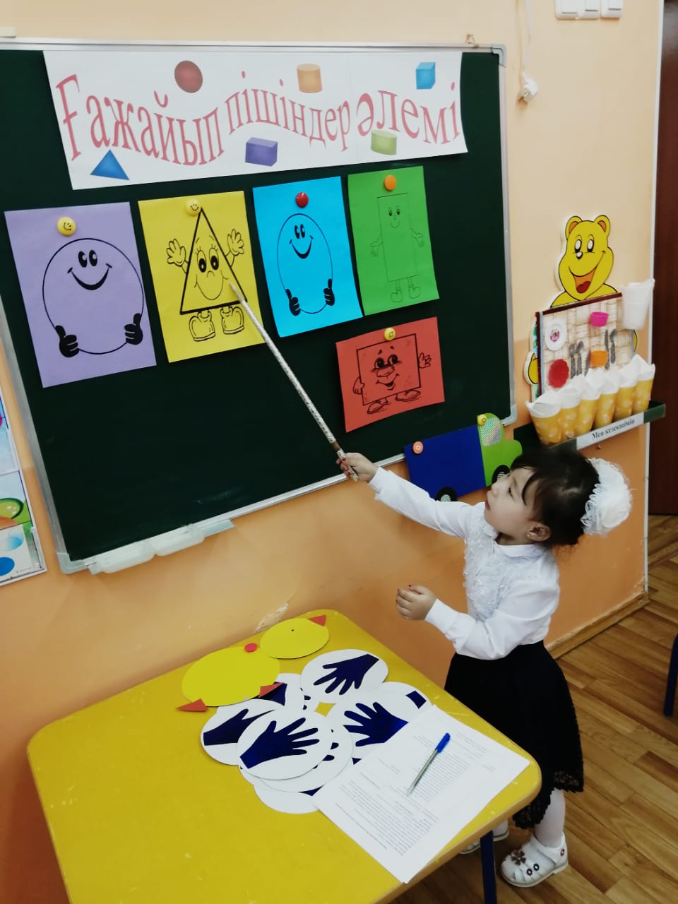Мақсаты: Балалардың геометриялық пішіндер туралы білімдерін қалыптастыра отырып , қарапайым математикалық ұғымдарын бекіту, пішіндерді ажыратып, айта білуге , оларды қоршаған ортамен салыстырып ,түр-түсін , заттардың көлемін анықтай білуге дағдыландыру.