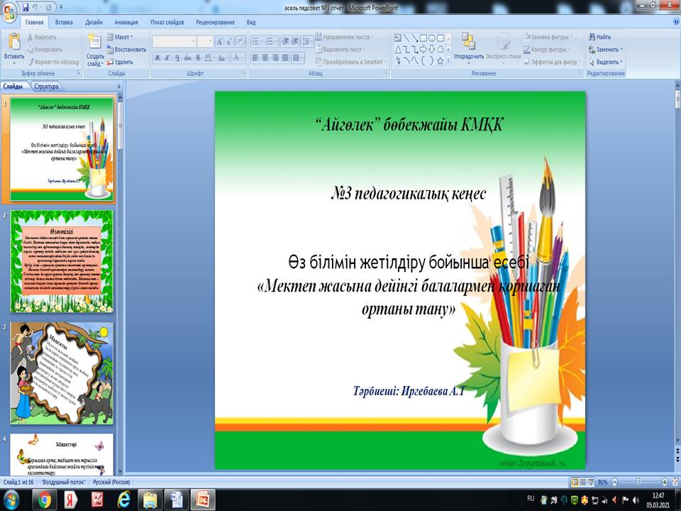 ZOOM платформасында «Мектепке дейінгі білім беру ұйымдарында ұлттық құндылықтарды қолдану тәсілдері» атты №3 педагогикалық кеңес өтті. Педагогикалық кеңесте тәрбиеші А.Т Иргебаева мен хореограф А.М Ербосынова "Өз білімін жетілдіру" бойынша педагогтардың есебі. Дене шынықтыру нұсқаушысы А.Е. Ергалиева, "Қазақтың ұлттық қимылды ойын түрлері, және оны оқу қызметінде қолдану тәсілдері".