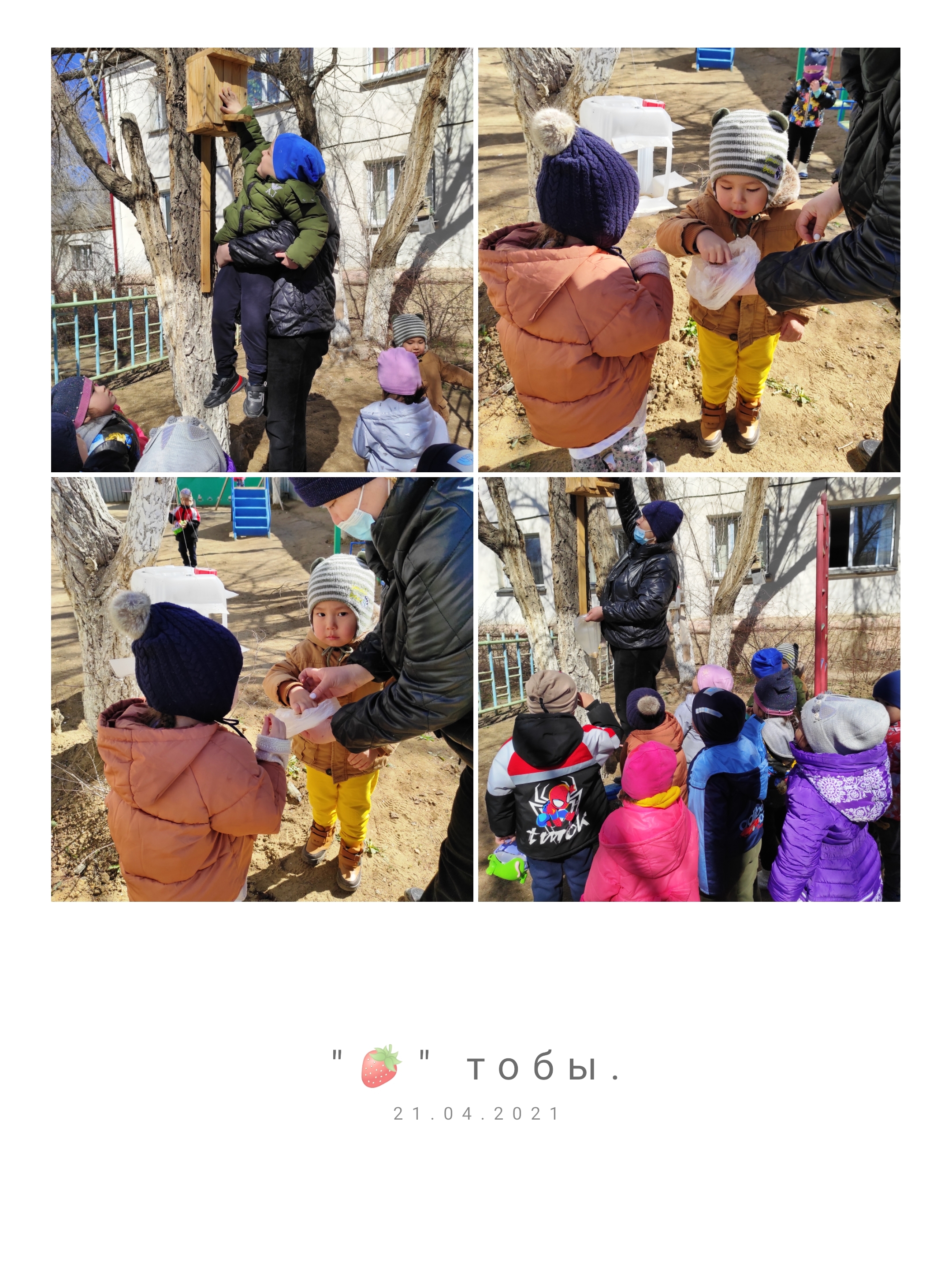 21 сәуір 2021 ж. "Табиғатты жүрегіңмен түрт" экологиялық сауаттылық апталығының ІІI-күні. «Құстарға қыстау қиын - біз құстарға көмектесуіміз керек» акциясы ортаңғы "Балдырған", "Құлпынай" тобының тәрбиеленушілері балабақша аумағында жем салғыш орнатты. #bugubaevaalmagul