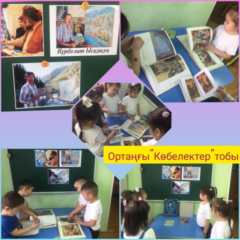 Ортаңғы "Көбелектер" және "Құлпынай" тобында өтті. Сабақтың максаты: Балалардың Қазақстан суретшілерінің еңбектерін, қысқаша өмірбаяның алғаш Қазақстан суретшісі Ә. Қастеев туралы мағлұмат беру. Балаларды әр түрлі тәсілдермен сурет салуға бейімдеу.