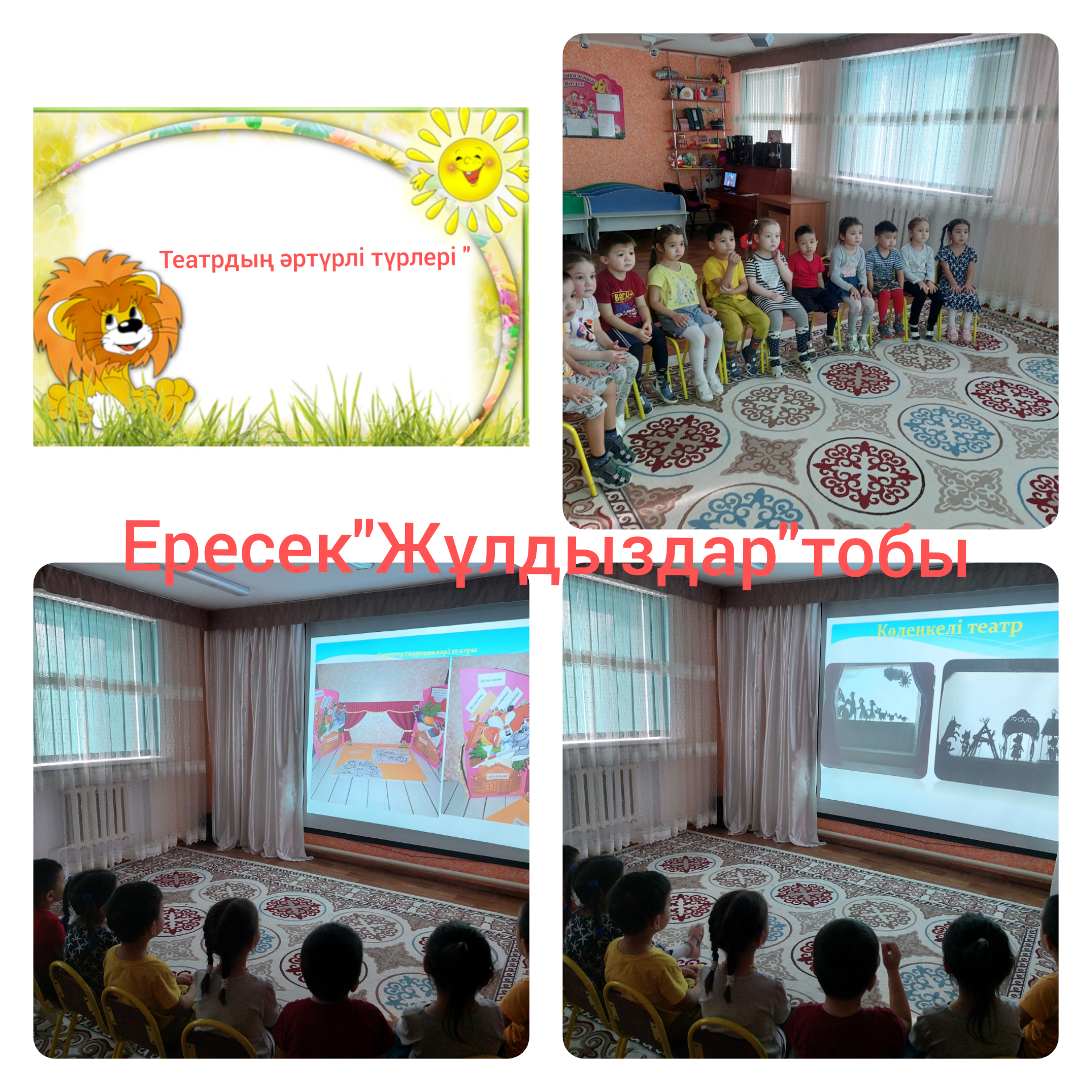 Ересек "Жұлдыздар" тобы мен "Балдырған" топтарында өтті. Театрдың әртүрлі түрлері туралы әңгімелесу. Мақсаты: Балалардың театр түрлері туралы білімдерін бекіту. Театр өнердің тәсілдері арқылы балалардың шығармашылық қабілеттерін дамыту. Балаларды адамгершілікке, ұйымшылдыққа тәрбиелеу.
