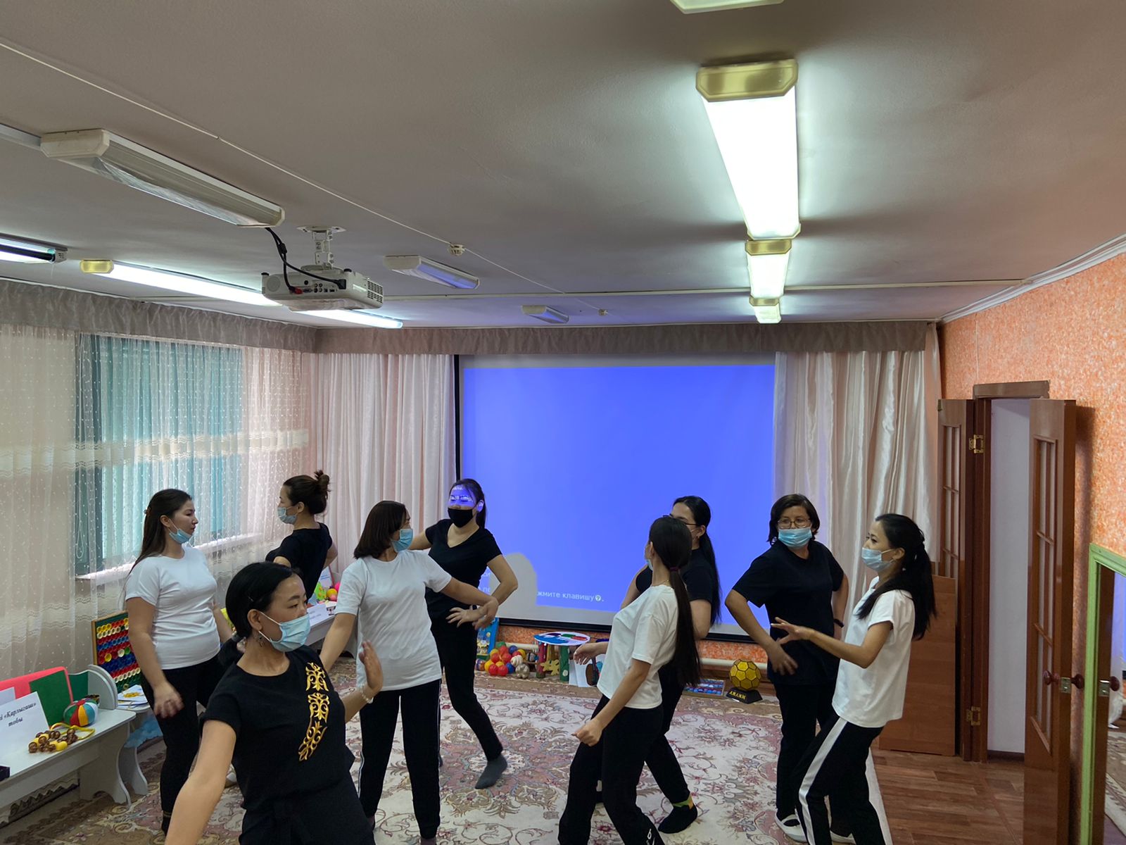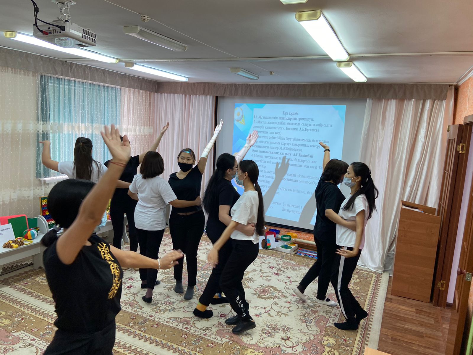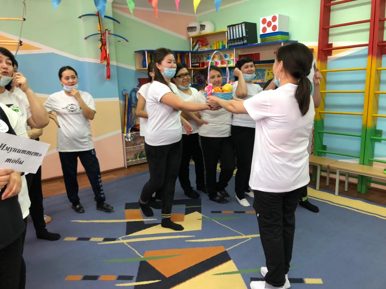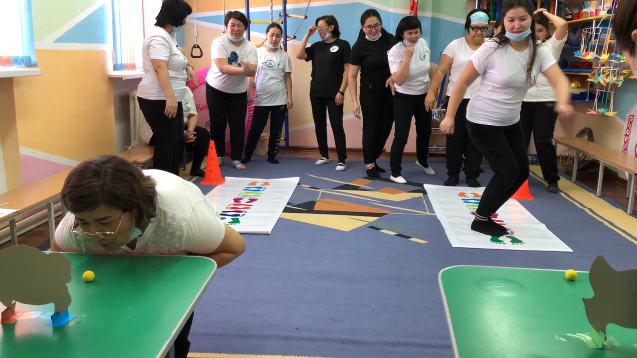 Практикалық бөлім педагогтармен. Ритмика "Қара жорға" Би жетекшісі С.Ө.Сағынбаева мен "Көңілді мәре" Дене шынықтыру нұсқаушысы: А.Е.Ергалиева