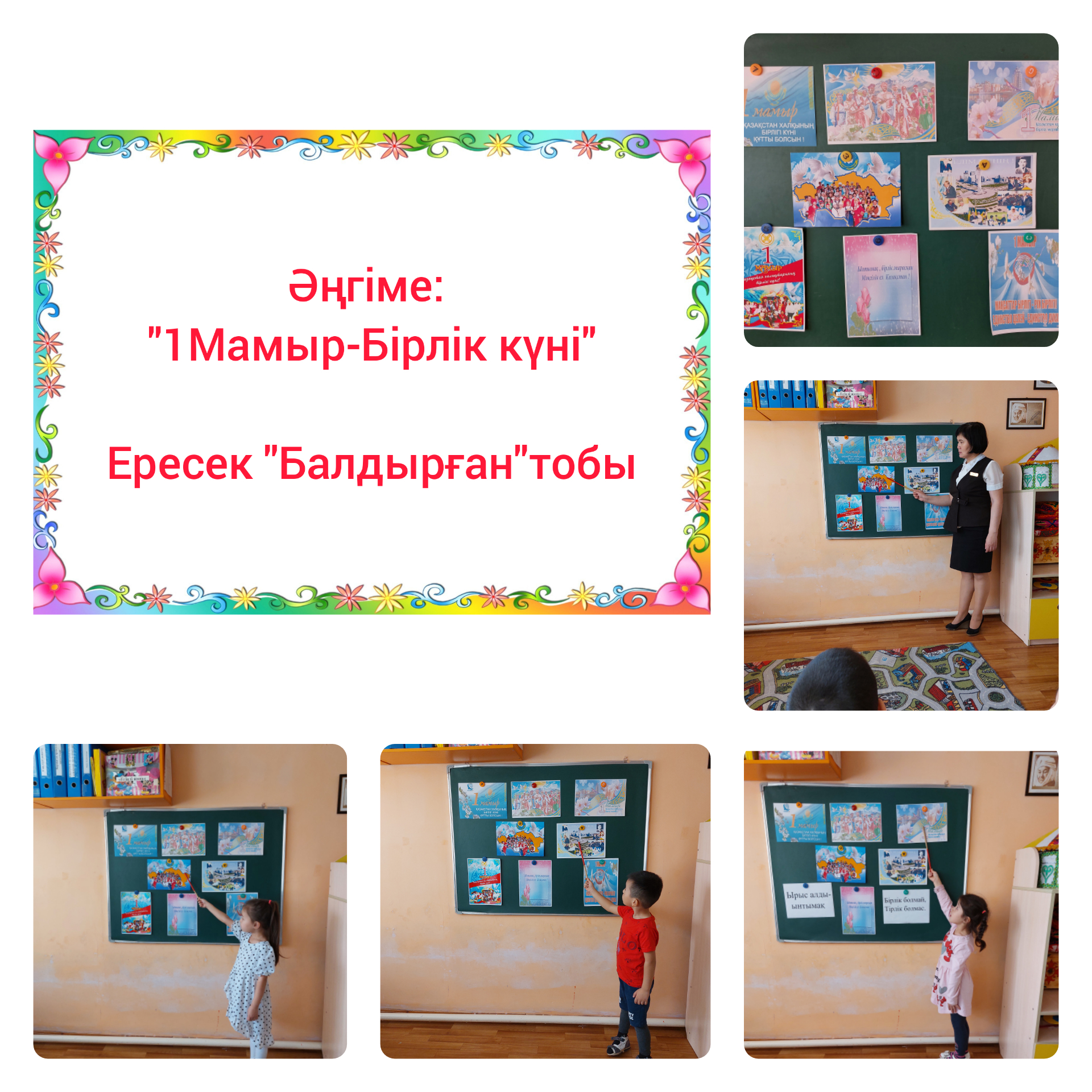 1 - мамыр Қазақстан халқының бірлігі күні. Ортаңғы топ «Күншуак» пен "Құлпынай" және ересек "Балдырған" топтарында әңгіме жүргізілді. Тақырыбы: «Бірлігіміз жарасқан» Мақсаты: Балалардың бірлік, ынтымақтастық туралы түсініктерін кеңейтіп, көп ұлтты халқымыздың тыныштығы мен бірлігін нығайтуға ат салысатын азамат болуға тәрбиелеу.