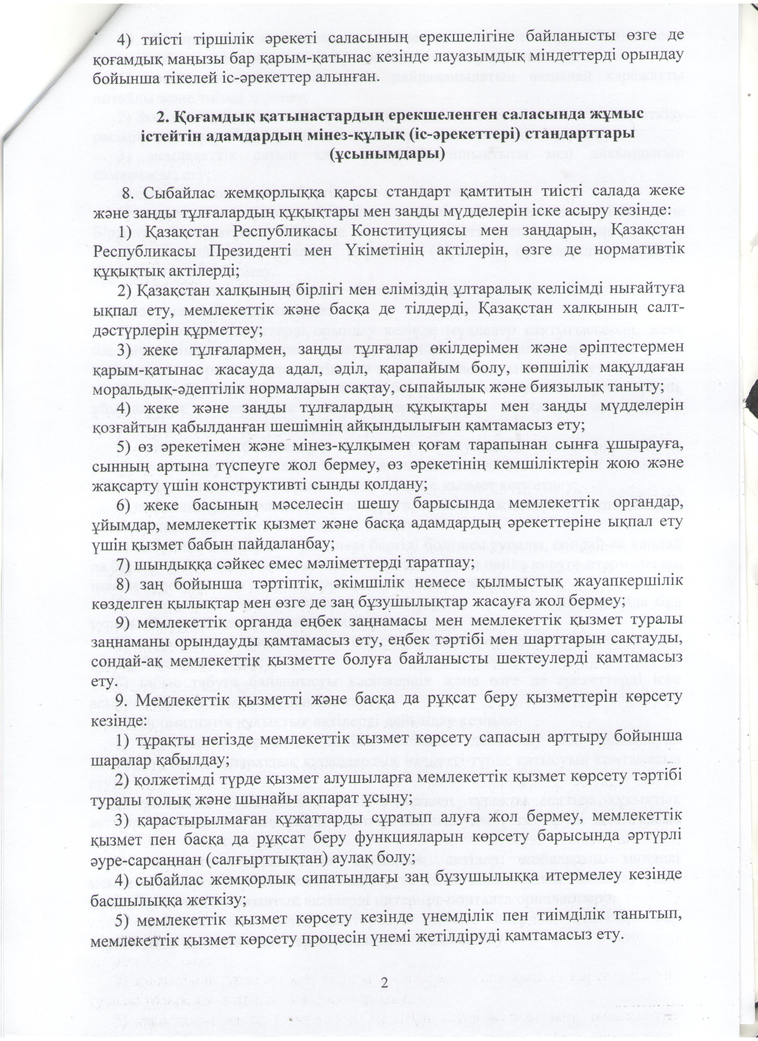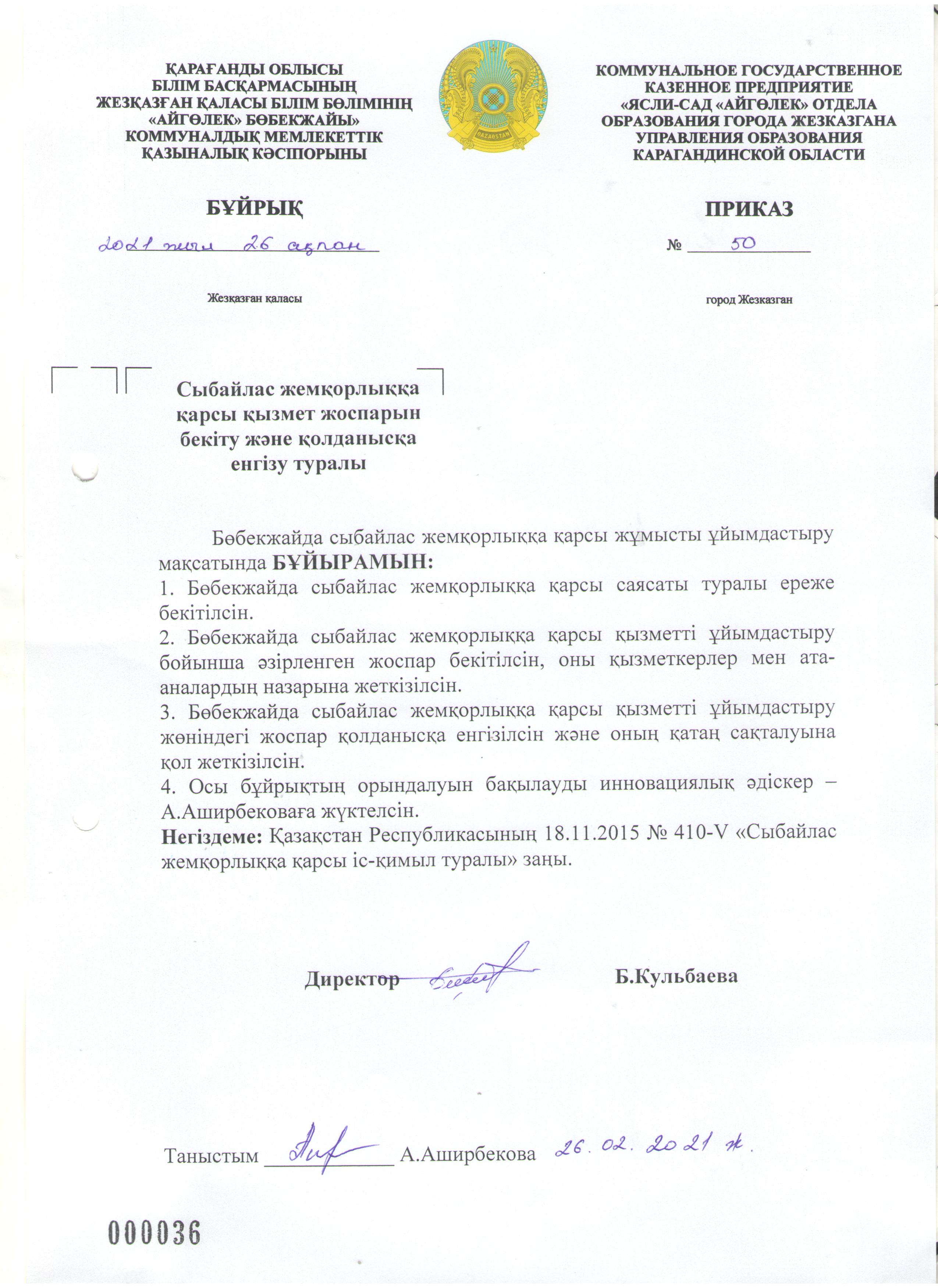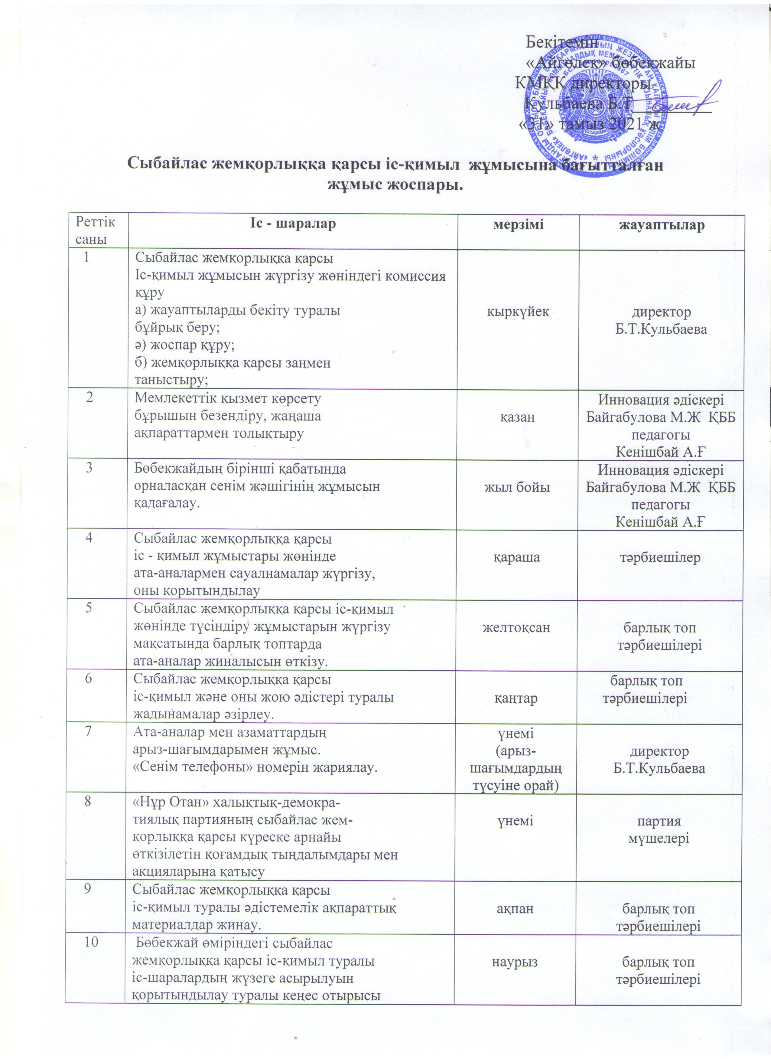 | 1 | План мероприятий на 2021 годы по реализации Антикоррупционной категории Республики Казахстан на 2015-2025 годы |