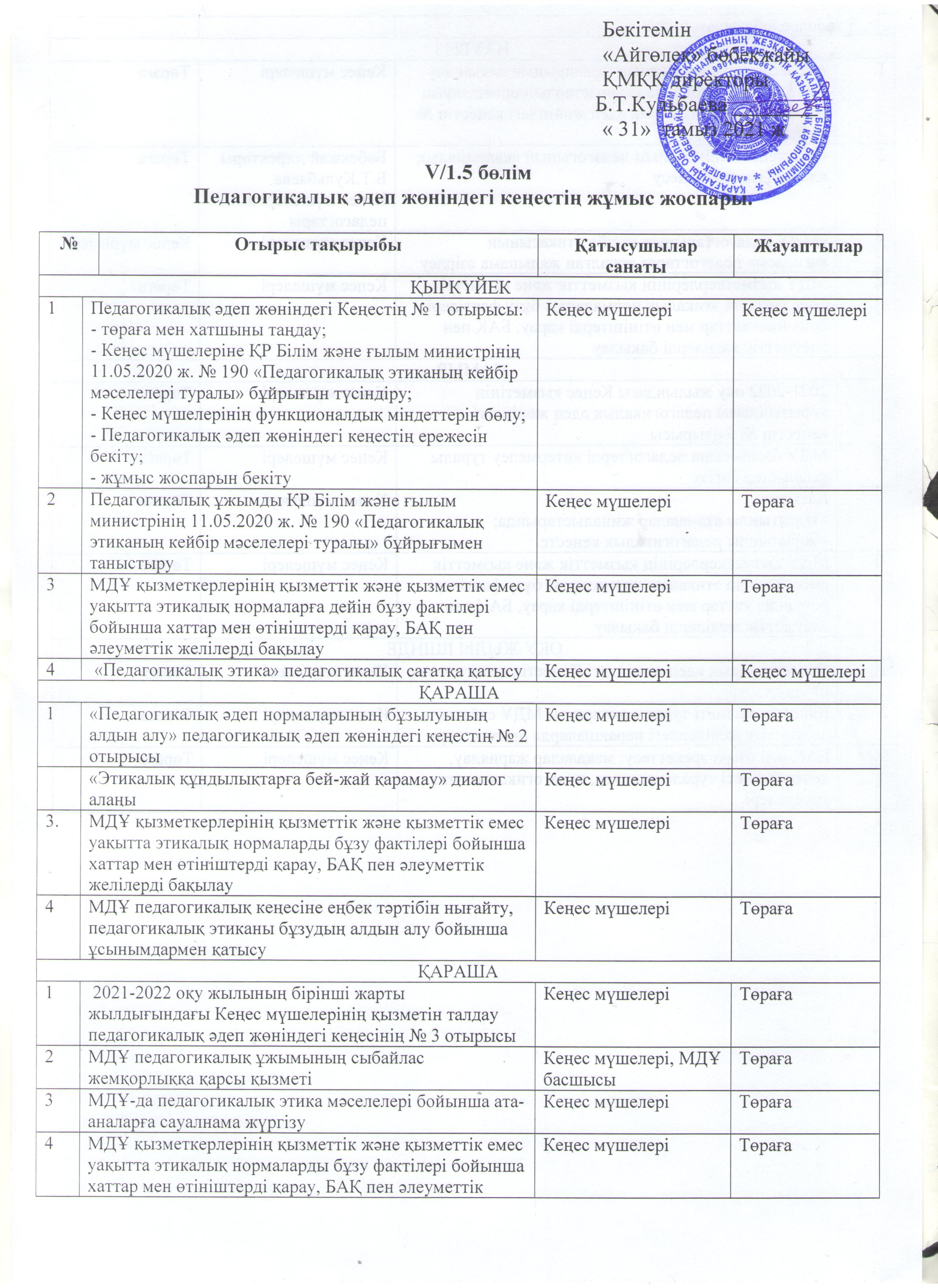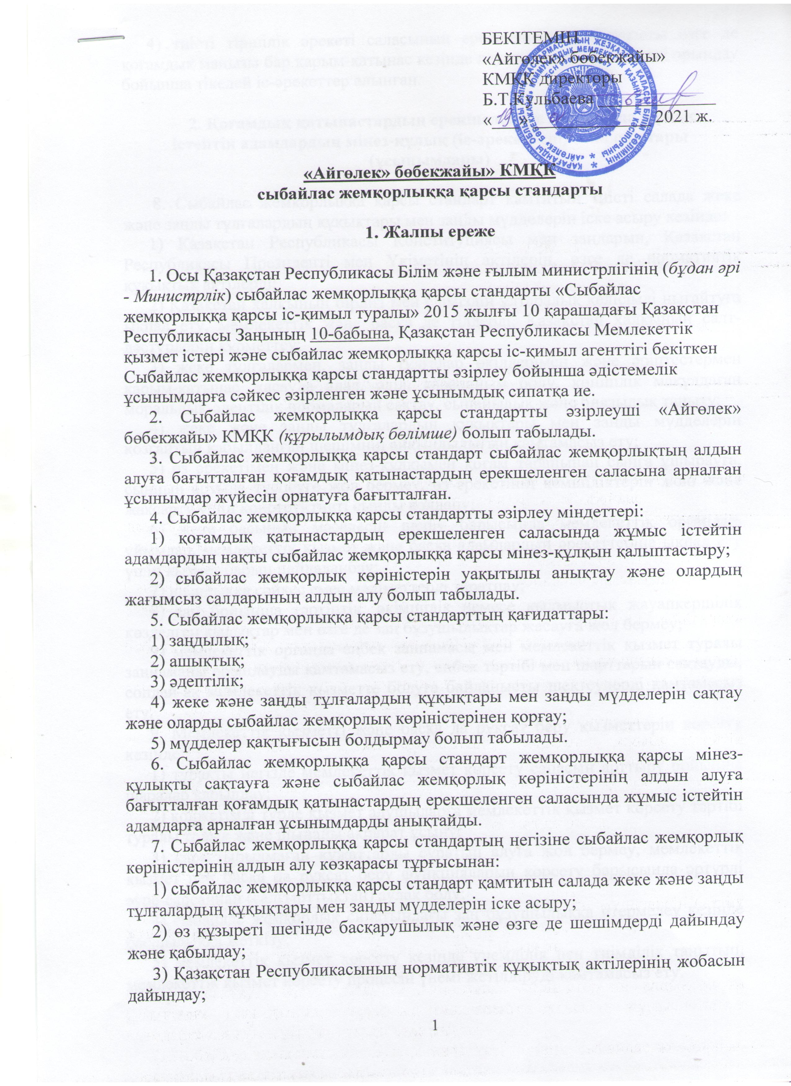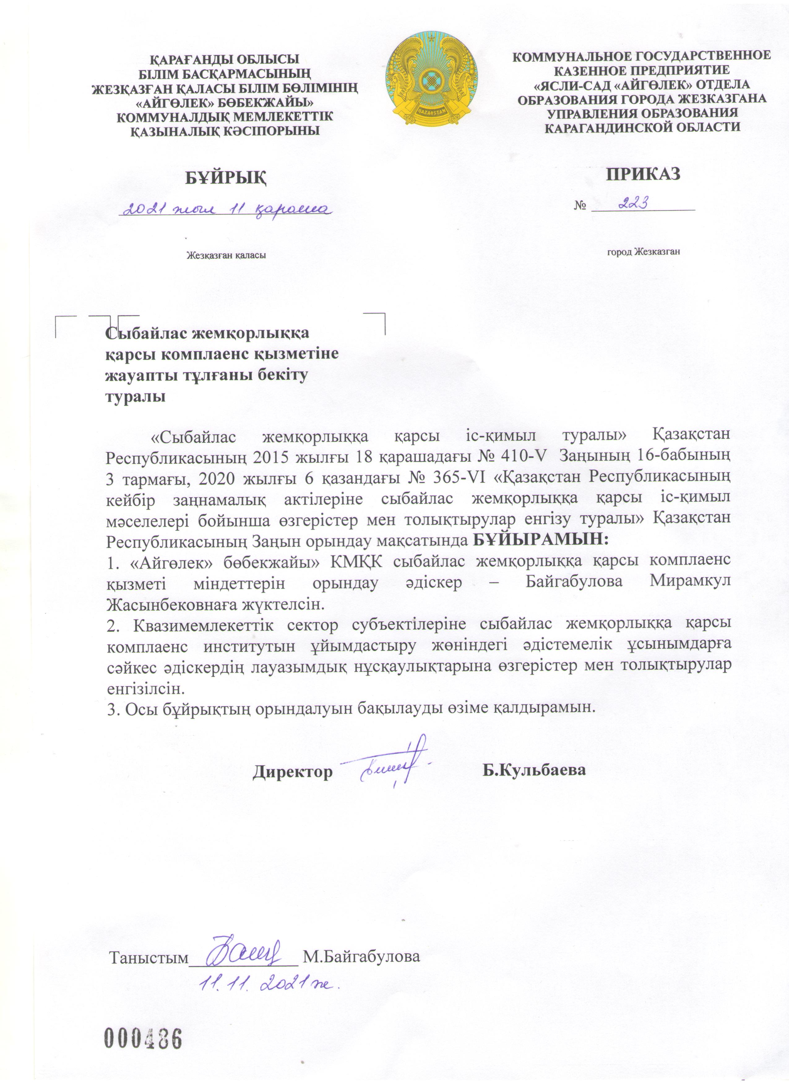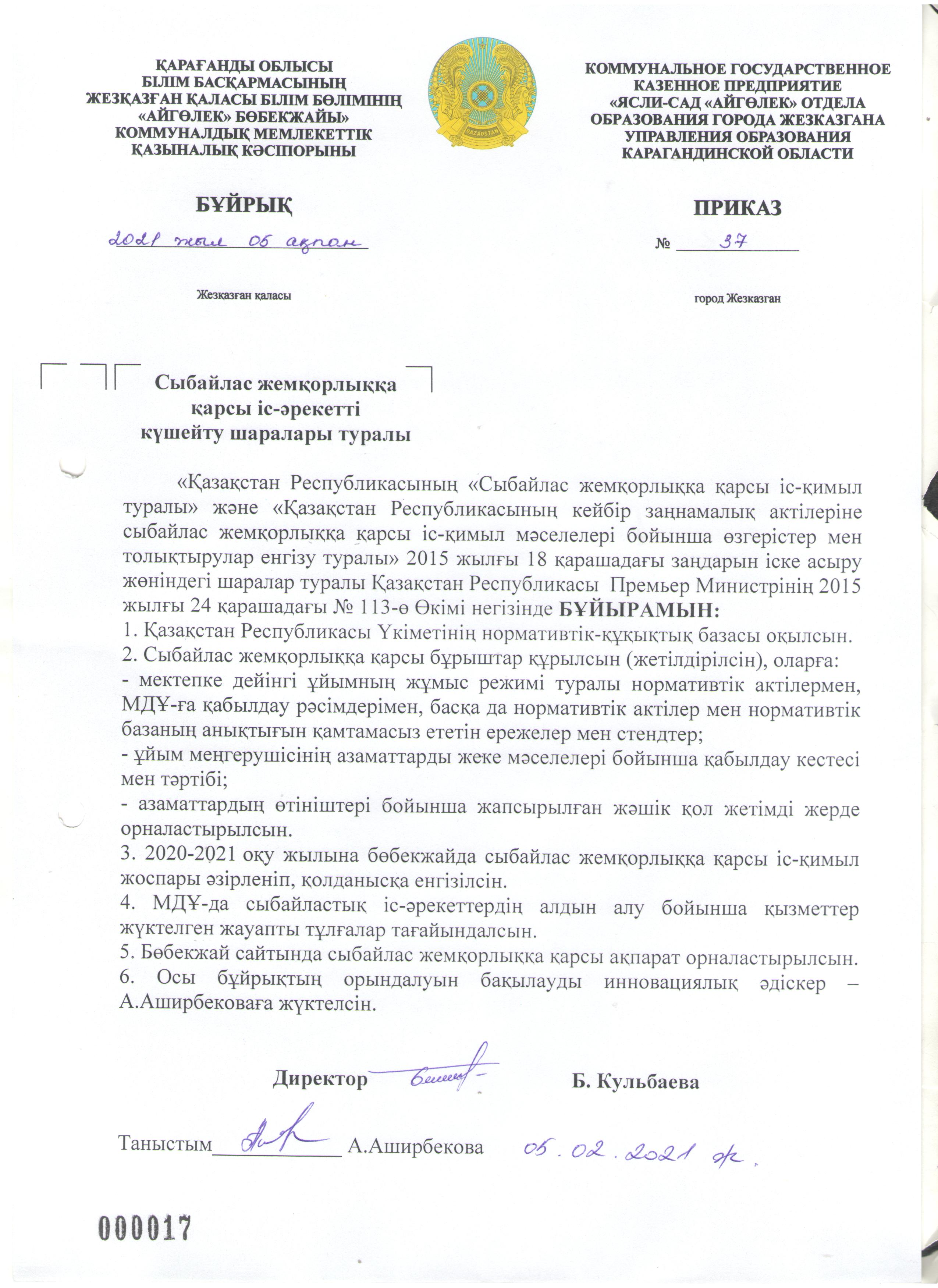 | 1 | План мероприятий на 2021 годы по реализации Антикоррупционной категории Республики Казахстан на 2015-2025 годы |